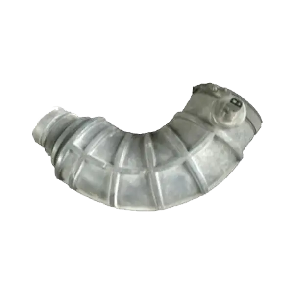 This curved flexible duct, likely constructed from reinforced rubber or silicone, serves as a connector within an engine’s air intake system.